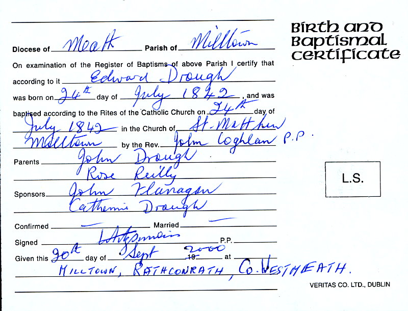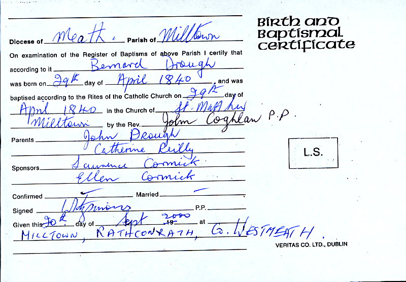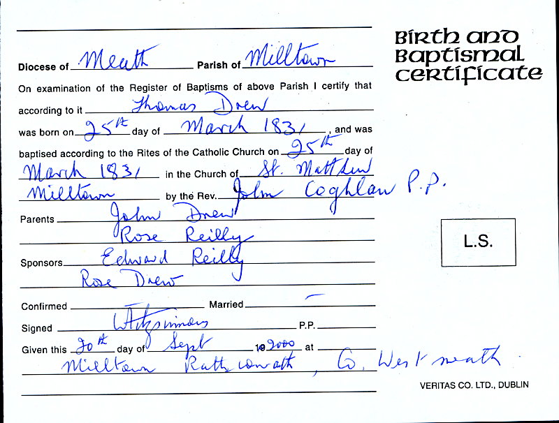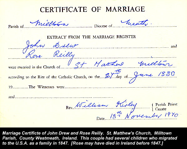 CLICK HERE or on the thumbnail at left to see John's baptism record A study of the parish's baptism records seems to indicate that John had six older sisters, but no brothers... and that he was, therefore, the "baby of the family." His older sisters were named Mary, Judith, Catherine, Bridget, Margaret, and Rose. All of these names (except for Bridget) recur frequently in John's descendants. His grandparents on the Drew side are thought to be James and Judith Drew; but the records at Milltown do not record mothers' maiden names or fathers' middle names, so it is impossible to trace his grandparents with certainty. Nonetheless, there is enough certainty to render us bold enough to keep Bernard Drew's 1784 birth certificate as an heirloom.