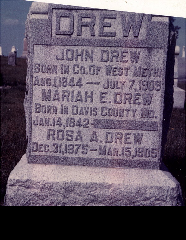 Also of interest in the 1880 census is the listing of Ann Melton, age 84, immediately above the entries for the household of John Drew Jr. It is not known if this "Ann Melton was the mother or the grandmother of Mariah Melton Drew, but the age difference suggests she was the grandmother. This Ann Melton's parents are listed as from Maryland and Virginia and (an awesome consideration) would both have been born BEFORE THE REVOLUTIONARY WAR. This, plus other facts listed elsewhere, would lead to the speculation that the Meltons were a "staunch" old family of ORIGINAL Daviess County homesteaders. It is further surmised that John Jr. would have "come of age" at a time when there were no more "homesteading" opportunities in Daviess County; and wound up settling there by reason of marrying into the Melton family... a totally different scenario than that of his elder brother, James. As for the Melton family and John Jr.; there are still some mysteries and unswered questions. John's occupation in the 1880 census is listed as "farm laborer" as opposed to "farmer" ...a distinction which suggests to me that John was NOT a landowner but was being allowed to live on the Melton farm (with his Melton wife.) It also appears (see the gravestone above) that John's wife, Mariah, was never buried in the plot planned for her beside her husband. Perhaps we shall some day stumble over some palatable "explanations" for these mysteries.