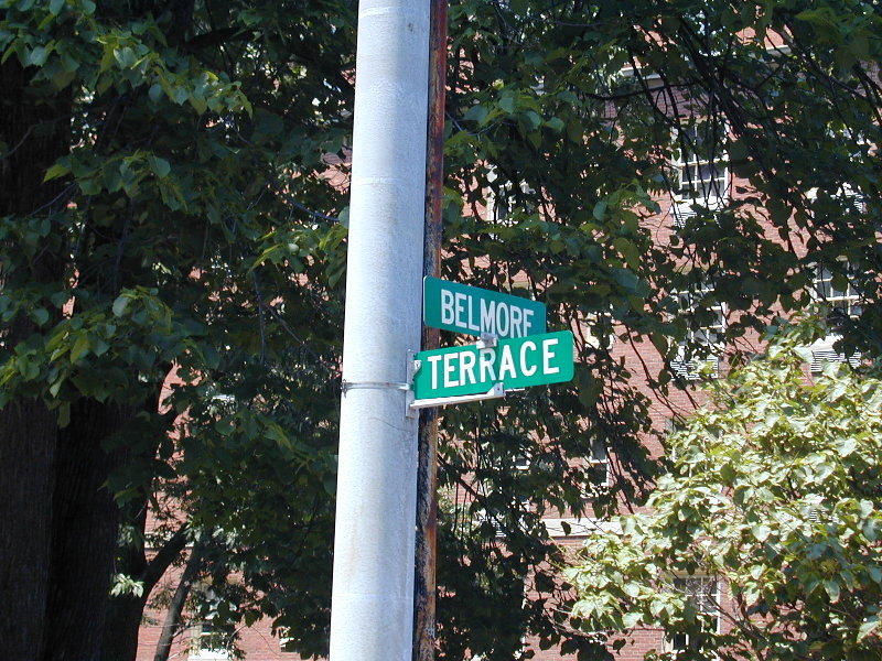 Looking north down Belmore, one sees several homes and appartments that look similar to the background in the 1921 photo. Aunt Louise, who lived there only as a little girl, believes the house was just a few houses from Euclid Avenue... which would place it down near the "tower" in the distance. The homes down there, however, have been razed to make room for a parking lot; and thus it is possible that the old Drew home is no longer standing.
