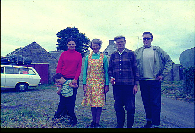 Another photo from our 1971 visit to the farm of Paddy and Anna Mary Drew. Pictured left to right are Marilyn Drew with John M. Drew, age 4; Anna Mary, Paddy and Dan Drew. Several buildings from the "village" of Lakenstown are seen in the background.