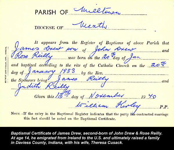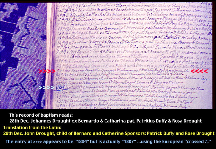 The 1970 picture above shows Daniel C. Drew looking over the shoulder of professional Genalogist and researcher, Berkley L. Vincent of Dublin Ireland. Without his patient and competent assistance and some incredible good luck, the Drew family history could not have been traced. The two men above worked very hard for many months to seek out the Drew family church records. As for the "luck" involved, very few Irish families would have the good fortune we had because records keeping was very poor in most places and many records have been destroyed by an early 1900's fire in the Dublin "Customs House" where the records were kept. Fortunately, the records of St. Matthews Church in Milltown were preserved... and when reviewed, the Drew family entries matched perfectly with the records in the old Drew and McGee family Bibles found in the U.S.