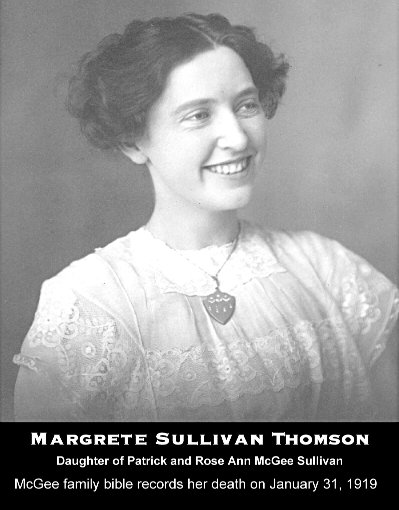 We have no document to show when Rose was married; but we know it was before 1880; for she does not appear as a memeber of the McGee household in the 1880 census. We know that she married Patrick Sullivan; and that their first child, Gertrude Ellen Sullivan, was born in 1881. As far as we know, there is no picture available of Rose Ann's husband, Patrick Sullivan; but there is a tradition that he might have been brother or cousin to Eugene Sullivan, who married Rose Ann's sister, Margaret McGee.