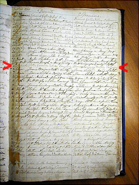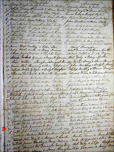 This photo shows the baptismal entry for Mary, daughter of Peter Grennan & Mary Conlin. Sponsors were Christopher Quinn and Mary Kain. The date was March 29, 1846. The spelling "Conlin" is thought to be a "slip of the pen" or lapse of memory on the part of the priest who made these entries. As can be seen, there were many many baptisms on this date; and it would be understandable that he might have "messed up" on his notes or remembered a name incorrectly. Careful review of other documents confirms that this entry would HAVE TO BE "our" Mary Greenen's baptism; and the priest really did mean to write "Conway." This entry is the ONLY occurrance of the name "Conlin" in all the records we reviewed in this parish. The Mary Greenen whose baptism is recorded here made "the trip" to America with her family and later married Patrick Graham and had many descendents.