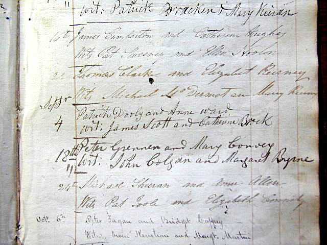 Above is a photo of the registry entry for the marriage of Peter Greenen and Mary Conway. As has been pointed out, each priest seemed to use a different spelling for the Greenen name, as well as the Conway name. The entry above indicates that "Peter Grennen and Mary Convey were married the 18th of September (1841 is not showing but is clear from the page headings.) The witnesses were John Colgan and Margaret Byrne.