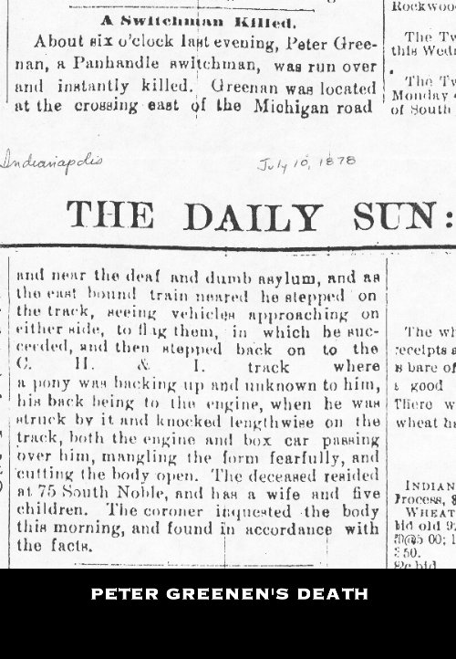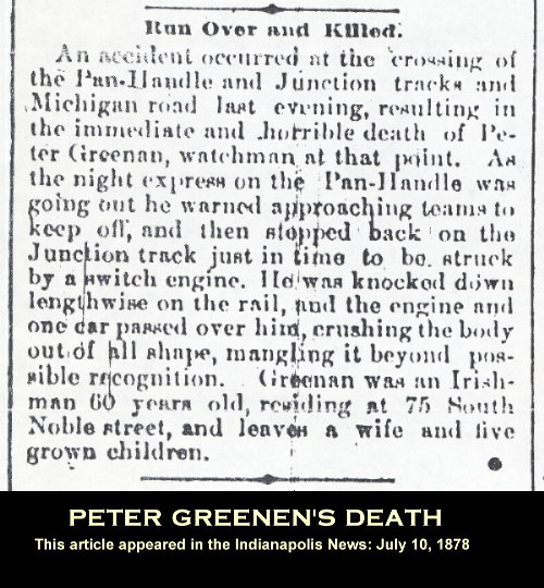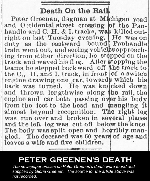 Careful research has shown that some of the information in these obituary notices is incorrect. Apparently there was a type of "news-service" in place at the time wherein a single reporter would gather information and pass it on to several newspapers; as the articles are all consistent in misspelling the Greenen name. Furthermore, careful and accurate research has revealed that Peter's age was 68 at the time of his death... NOT 60.