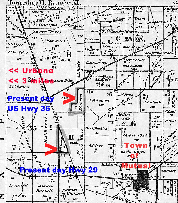 US 36 and Highway 29 are indicated in blue; and the town of Mutual is shown