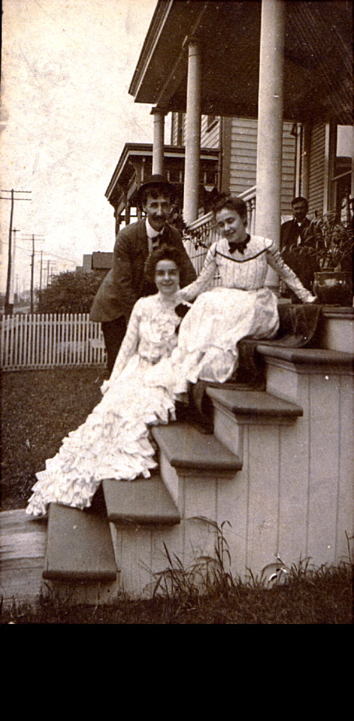 Date of this photo is about 1898. The place is not identified. The gentleman in the background (Seated up on the porch) is "J.W." Greenen. There can be NO DOUBT that the young lady on the lower step is his daughter, BLANCHE CECELIA GREENEN... Later Drew. The young man behind Blanche might be one of her brothers (perhaps Alf?) The young lady seated on the top step is Blanche's cousin, RUBY KRUEGER, (Daughter of Julia Ryan Krueger.) The young man might also be Ruby's brother or some other cousin. It is believed that the picture was taken at a "Ryan sisters (Greenen-Krueger) gathering" ...as there are other photos taken on this same day which tend to confirm that.