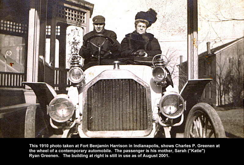 This photo was taken in 1910 at Fort Benjamin Harrison in Indianapolis. Other photos taken the same day are clearly labelled. This photo was not labeled, however it is believed to show Charles P. Greenen at the wheel with his mother, Katie Ryan Greenen in the passenger seat.
