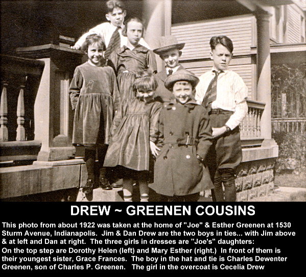 This photo from about 1922 was taken at the home of "Joe" & Esther Greenen at 1530 Sturm Avenue in Indianapolis. Jim & Dan Drew are the two boys in ties... with Jim above & left and Dan at right. The three girls in dresses are "Joes" daughters: On the top step are Dorothy Helen (left) and Mary Esther (right.) In front of them is their youngest sister, Grace Frances. The boy in the hat and tie is Charles Dewenter Greenen, son of Charles P. Greenen. The little girl in the overcoat with her hand in her pocket is Blanche "Cecelia" Drew.