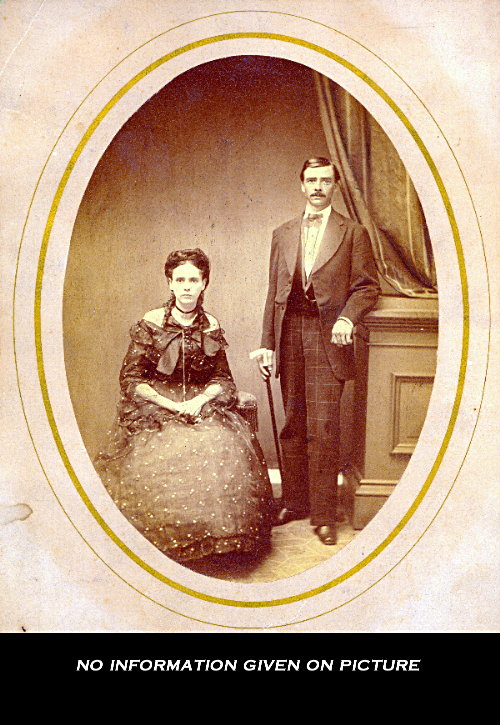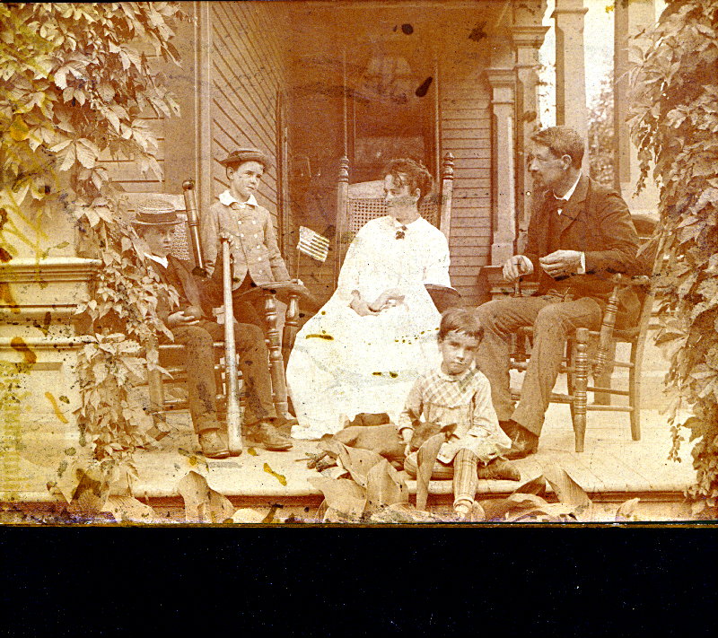 The actual label (that goes in the black space) will come later when we are more certain of things. We now feel certain that the two adults are Joseph W. ("J.W.") and Sarah "Katie" Greenen. We also feel certain that the little girl is Blanche Greenen (later Drew.) Obviously, the picture shows only two of Blanche's four brothers... which is what throws us a little. The boys are probably Charlie and Joe. The two younger brothers (Tom and Alf) were either not at home... or were misbehaving too badly to have their pictures taken. The boys in the picture look like they'd rather be playing baseball or swimming. The photo, I believe, was taken in 1883... and obviously in the summertime... with baseball and bat ready Fourth of July Flag out, and vines climbing all over the porch. Note that in 1884, all girls had to have their legs covered at all times... even on the Fourth of July! Again, I do believe J.W.'s rheumatoid infirmity is visible in this photo if you look closely at his hands.