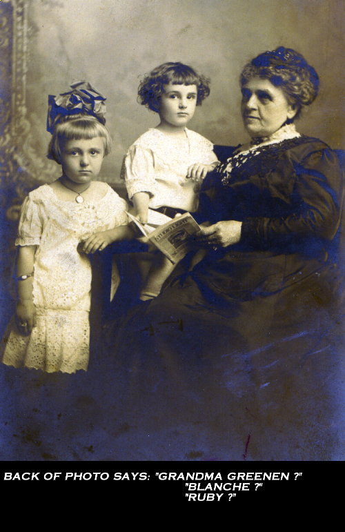 Too bad the question marks were on the back of the photo. This is a MOST INTERESTING one! After much study, the best assumption is that this photo shows Mary Conway Greenen (born 1810) with two of her grandchildren... but they do NOT appear to be the children of Joseph. They are probably the children of one of here other children, Mary, Anna, or Michael (See Greenen Family History posted at http://www.wildirishroots.com/GREENEN/1810Peter Greenen/1810PeterGreenen.html