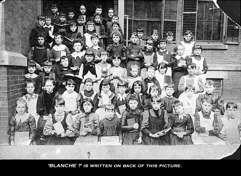 The pencil mark you see on the photo was (perhaps) put there by the same person who labelled the back of the picture "Blanche?" Neither the pencil mark or the question mark were my idea... and were probably made by a contemporary... (Who else would call her by her first name?) The arrow points to a little girl of about 10 in the front row. If that is Blanche, then this is about a 1890 photo.... and that date would jive with the properties of the photo. At this time, Blanche would have been attending St. John's Grammar School in Indianapolis.