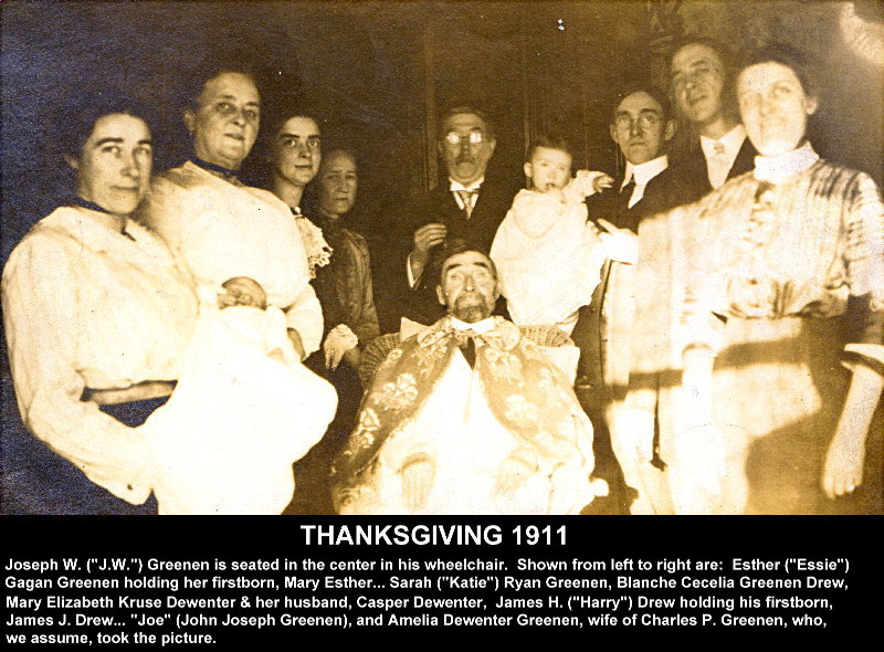 This photo was taken at Thanksgiving 1911. Joseph W. ("J.W.") Greenen is seated in the center in his wheelchair. [One theory about the garment he is wearing is that its purpose was to hide his wheelchair... the back of which is visible nonetheless.] Shown from left to right are: Esther ("Essie") Gagan Greenen holding her firstborn Mary Esther, Sarah ("Katie") Ryan Greenen, Blanche Cecelia Greenen Drew, Mary Elizabeth Kruse Dewenter & her husband, Casper Dewenter, James H. ("Harry") Drew holding his firstborn, James J. Drew, "Joe" (John Joseph) Greenen, and Amelia Dewenter Greenen, wife of Charles P. Greenen whom we assume took the picture.