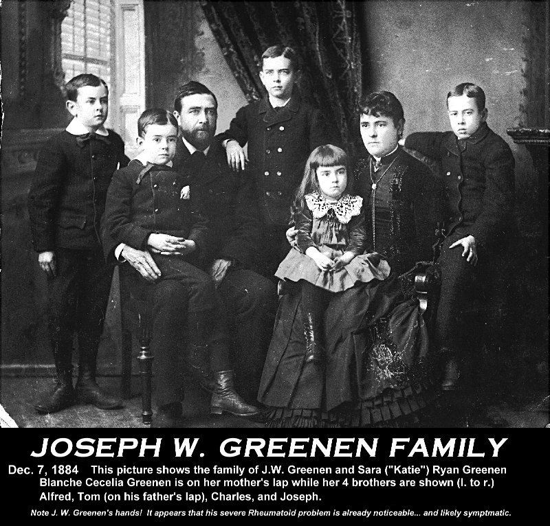 This photo was taken December 7, 1884 in the home of the Joseph W. Greenen family at 120 N. Arsenal Avenue in Indianapolis Blanche (4) is seated on her mother's lap and her 4 brothers are shown (left to right:) Alfred Clement (8), Thomas William (8, seated on his father's lap), Charles Peter, and John Joseph ("Joe.") J.W. Greenen's age was 42 and his wife, Sarah Catherine ("Katie") Ryan Greenen was 36.