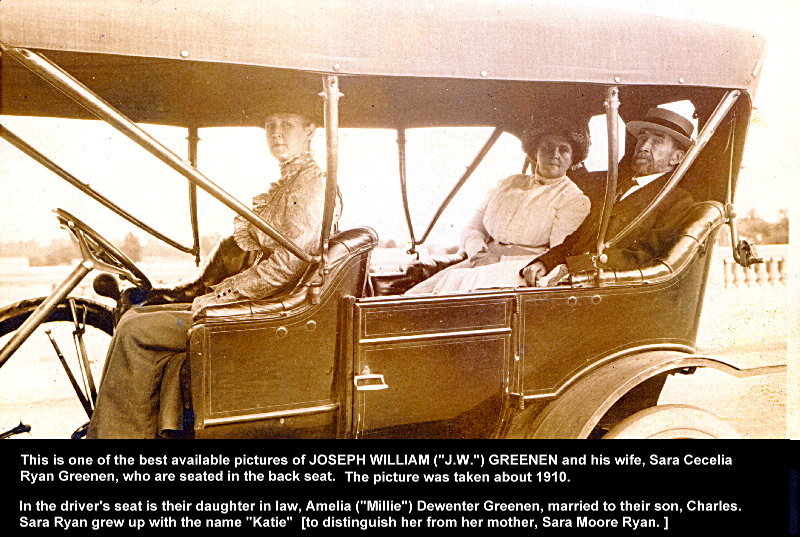 This photo was taken about 1910 in Indianapolis. Seated in the back seat are Joseph W. ("J.W.") Greenen and his wife, Sarah ("Katie") Ryan Greenen. Seated in the front seat is Amelia Dewenter Greenen, their daughter-in-law, wife of Charles P. Greenen. It is assumed that "Charlie" (an avid photographer) took the picture.