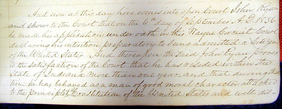 Click to enlargeThe court records do not indicate the exact date on which John Ryan was pronounced a citizen of the U.S. However, we know that he got married on August 21, 1838... and there is every reason to suspect that John (and Sarah) celebrated these two events as one gigantic "happening." It is quite possible that the citizenship ceremony and the marriage occurred on the same day.
