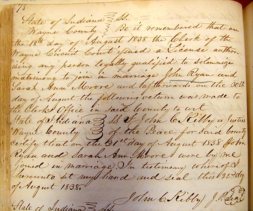 On August 21, 1838 John Ryan was married to Sarah Ann Moore in Richmond, Indiana, by Justice of the Peace John C. Kibbey. CLICK HERE or on the thumbnail at left to see the record of this marriage recorded in the Wayne County Marriage Register. At the time of their marriage, John would have been 26, and Sarah 19 or 20. As to the question of why an Irish Catholic would be married by a Justice of the Peace... and why there is no record of a church wedding, it has already been pointed out that Sarah Moore was definitely NOT Catholic; and my generation can remember how militantly the Catholic clergy attempted to avoid "mixed marriages." My elders (as well as historians) also assert that this "injunction" (both written and oral) was even harsher and more militant in the days of John Ryan. Furthermore, IF Sarah was indeed from a Quaker family, there would have been a double dose of negativity... with Sarah's family and pastor also unwilling to give their blessing to this marriage.