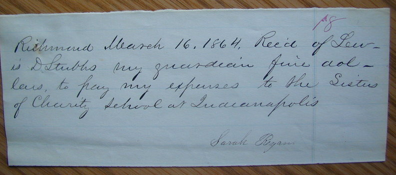 By 1864 (and maybe sooner) both Sarah and Julia are attending school at St. John's in Indianapolis, a reputable Catholic boarding school for girls. Katie would have been 16, Julia, 12 or 13. The wonderful collection of receipts found in the Wayne County Courthouse by researcher Arnold Dean, clearly indicate payment of both tuition as well as rail transportation to and from Richmond to attend school. Note that the receipts indicate that the school was run by the "Sisters of Charity" ...but careful research by Andy Sauer have proven that the sisters running the school were the Sisters of Providence, headquartered in Terre Haute... and that this order of nuns (as well as several others) were referred to "generically" as the "Sisters of Charity" because of their work with the sick and wounded during the civil war; and are not to be confused with the "Sisters of Charity of St. Vincent DePaul." CLICK HERE to see a sample of a receipt for "Katie's" schooling in Indianapolis