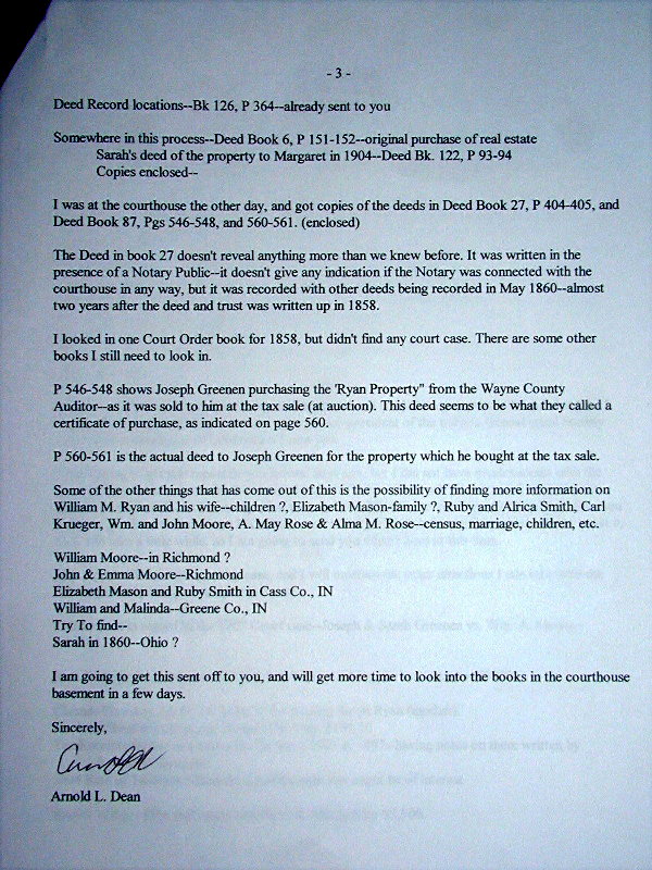 The following letter is a summary of these proceedings based on documents discovered and analyzed by professional researcher, Arnold Dean, president (2001) of the Wayne County Genealogical Society.