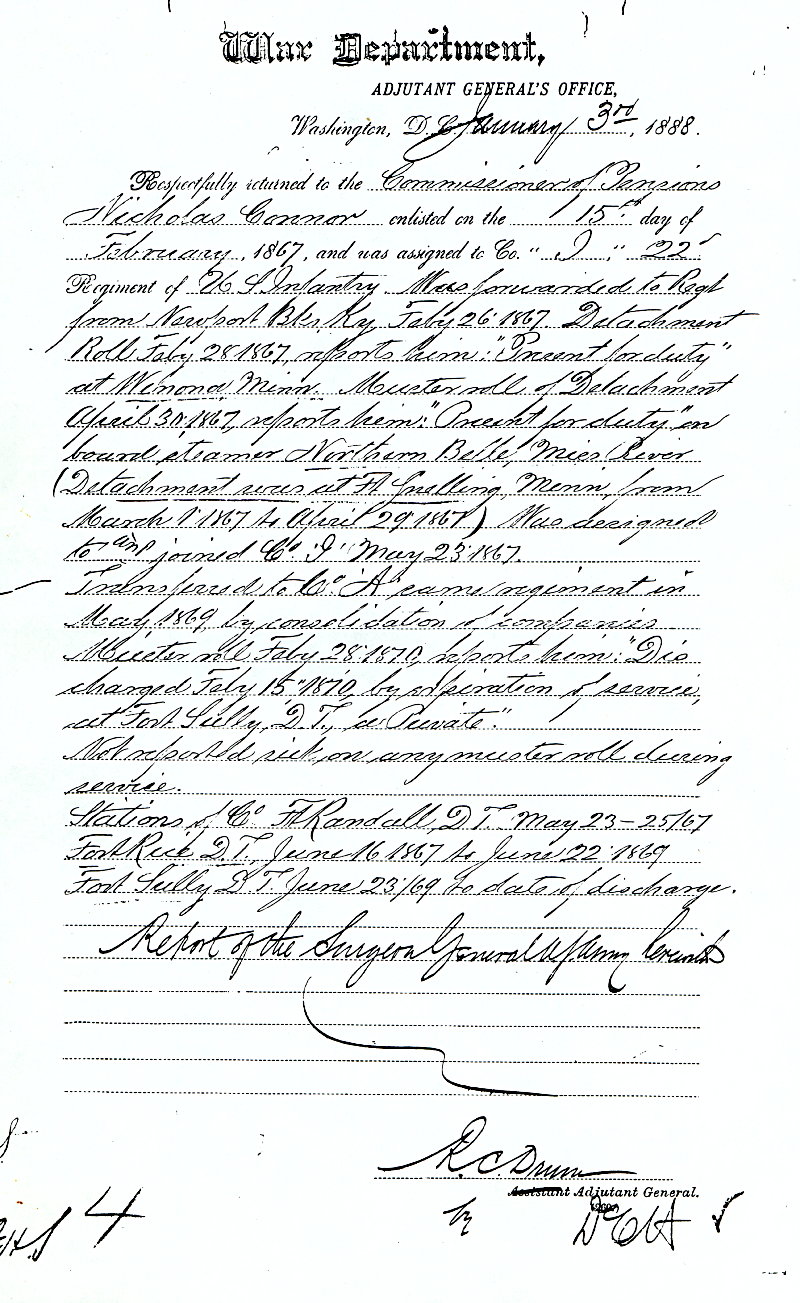 Nicholas Connor enlisted on the 15th day of February, 1867 and was assigned to Company I, 22nd Regiment of U.S. Infantry. Was forwarded to Regiment from Newport Barracks, Kentucky February 26th, 1867. Detachment Roll February 28, 1867 reports him: "Present for duty" at Winona, Minnesota. Muster roll of Detachment April 30, 1867, reports him: "Present for duty" on board steamer Northern Belle, Mississippi River. (Detachment was at Fort Snelling, Minnesota, from March 1, 1867 to April 29, 1867.) Was assigned to and joined Company I May 23, 1867.