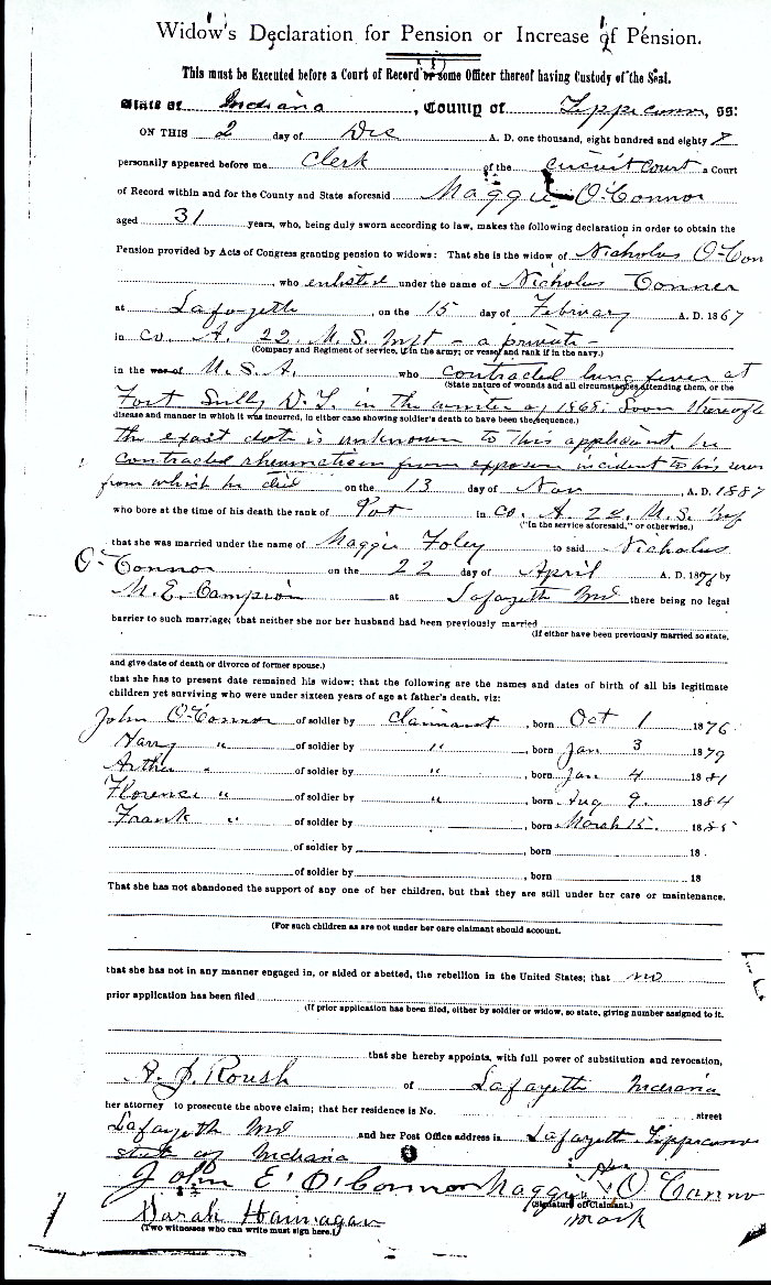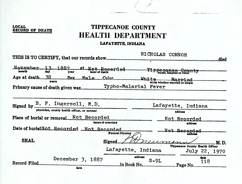 DEATH OF NICHOLAS O'CONNOR The entire "affair" of Nicholas' disability, his post war activities, and death is probably best summarized in the "addendum" to "Bo" Connors book, Hampton Court, which I take the liberty to adapt as follows: Nicholas' name was changed from O'Connor to Connor at the time of his enlistment. He was discharged as a private after serving a three year hitch. Joining the service proved to be a mistake. He contracted "lung fever" in the harsh winter at Fort Rice in the Dakota Territory (where he spent the vast majority of his time in the service.) This was followed by acute rheumatism due to exposure. After his discharge from service, he became a railroader but for the rest of his life he was bothered by pain in his hips and legs, often being forced to spend weeks in bed, until he died in 1887 at the age of 38. The Tippecanoe Health Department listed his death as due to typho-malarial fever.