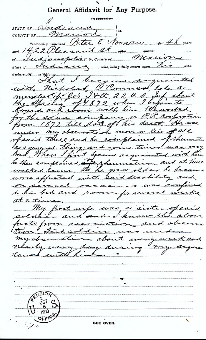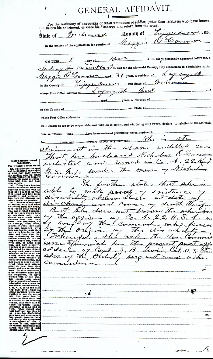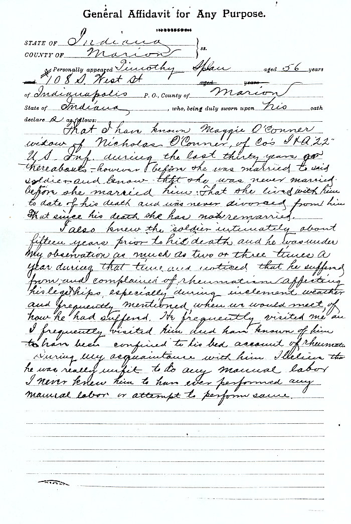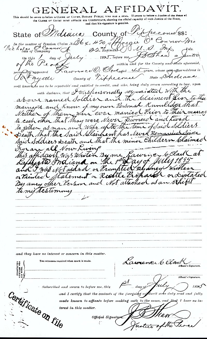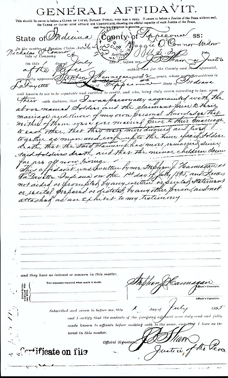 Maggy's official application for Widow's pension for her 4 children. [Still pregnant with Nick Jr.]In 1895, Maggie was apparently required to furnish more proof of her eligibility for widow's pension. By this time, her eldest son, John would have been 19 and her youngest, Nick Jr. would have been just 7. The family was still living in Lafayette, Tippecanoe County. Maggie apparently had no problem rounding up relatives to provide the necessary sworn statements (Affidavits.)