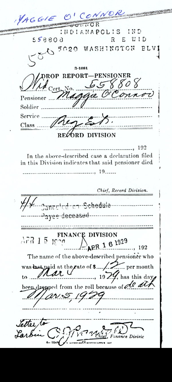 DEATH OF MAGGIE CONNOR At the time of Maggie's death, a "drop report" was generated by the Indianapolis office that managed her pension payments. CLICK HERE to see a copy of that report.