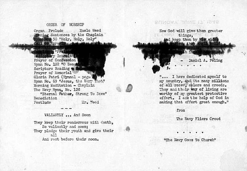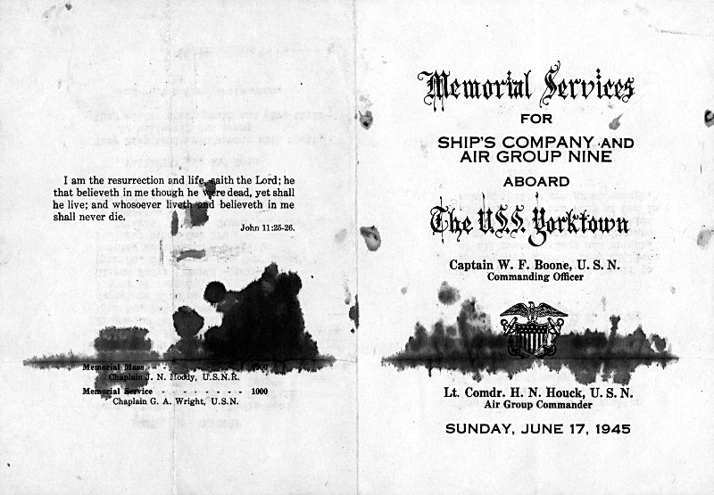 The two photos below are photos of the "program" printed and distributed aboard the Yorktown on the occasion of the memorial service held June 17, 1945. Tom's body was never recovered; so we can assume that this service would have been (in the eyes of the Navy) Tom's funeral. The biblical texts chosen by the ship's chaplains are certainly moving .