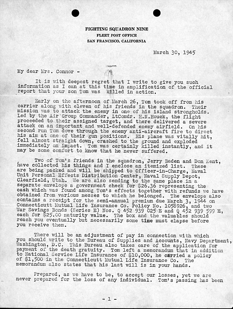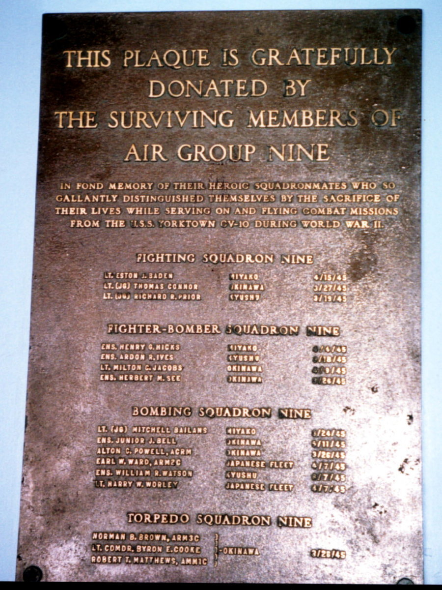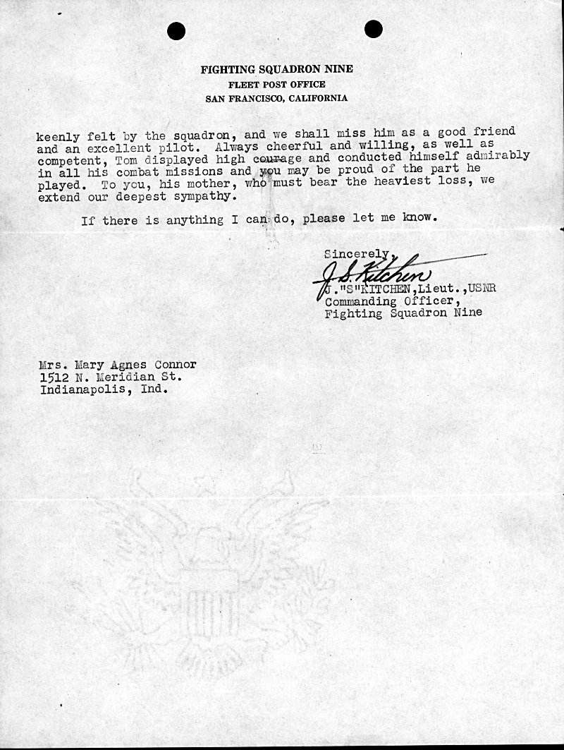 The letter below was written to Tom's mother, Mary Agnes Egan Connor, by Tom's commanding officer. "Gram" Connor was already five years a widow by this time and had three other sons on active military duty. When reading the letter, note that Jerry Baden and Don Kent were assigned to "gather up" Tom's personal effects and help sort out whatever papers etc. were left in his quarters. Further down this page I have displayed photos of the plaques on display on board the Yorktown at her final resting place in Charlestown South Carolina as of 2001. We notice from the plaques that Jerry Baden was also killed in action just a few days after Tom.