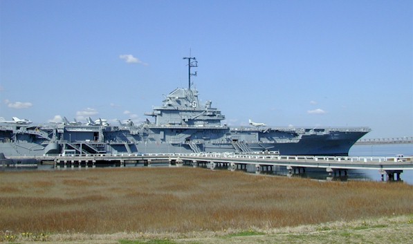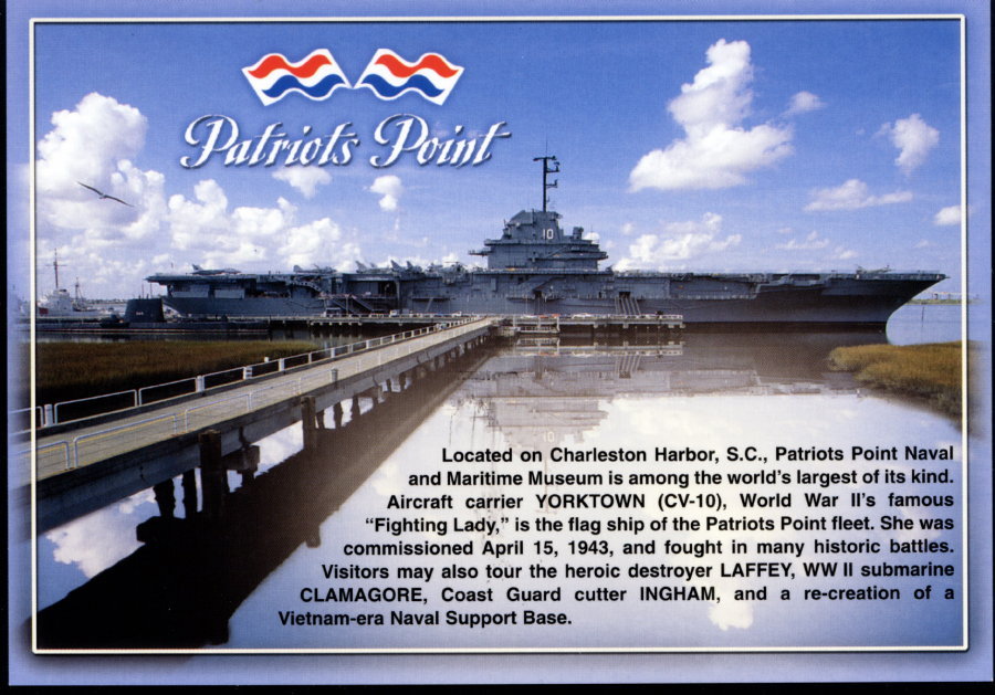 Note that the document has been stained in a pattern that is obviously the result of a leaky "fountain pen." Those old enough to remember "pre-ballpoint pen" days will understand this. I cannot help but notice that the leaky fountain pen combined with the fold of the document has resulted in a series of "Rohrshock" patterns. (which also might fall "beyond" younger readers and non scholars.) Yes, I have "done the Rohrshocks" that leaked onto Tom's funeral document... but I will not burden you... Each reader may do his/her own reading!The Yorktown's final "port" in Charleston SC is shown on the postcard above. As of 2001, she is all "decked out" for visitors and tourists. The principal attraction for thousands are replicas of the Hellcat and other planes who flew from her decks. For many hundreds of Americans, however, the principal attraction is the memorial plaques honoring those who died. Tom's placque is shown below.